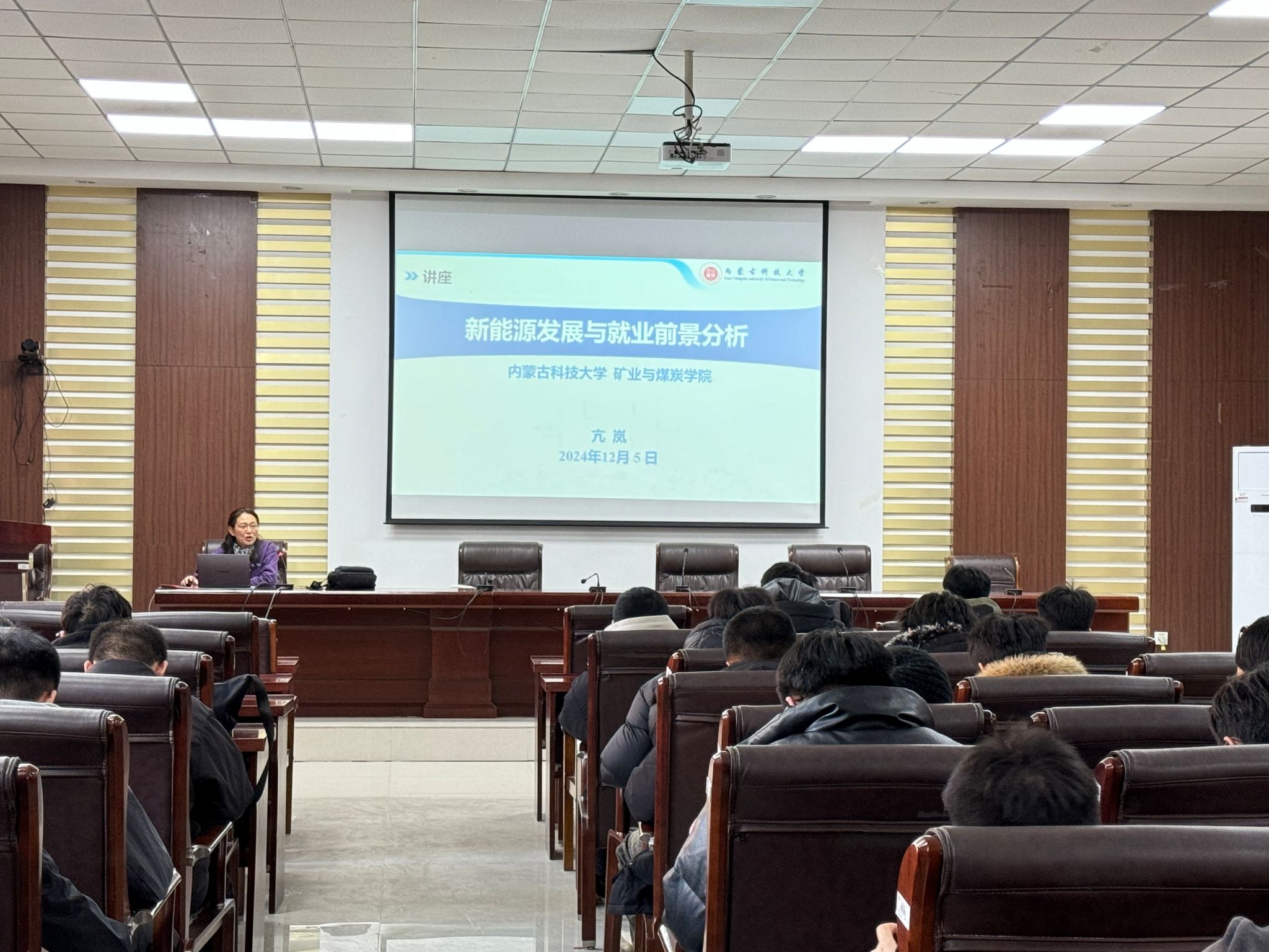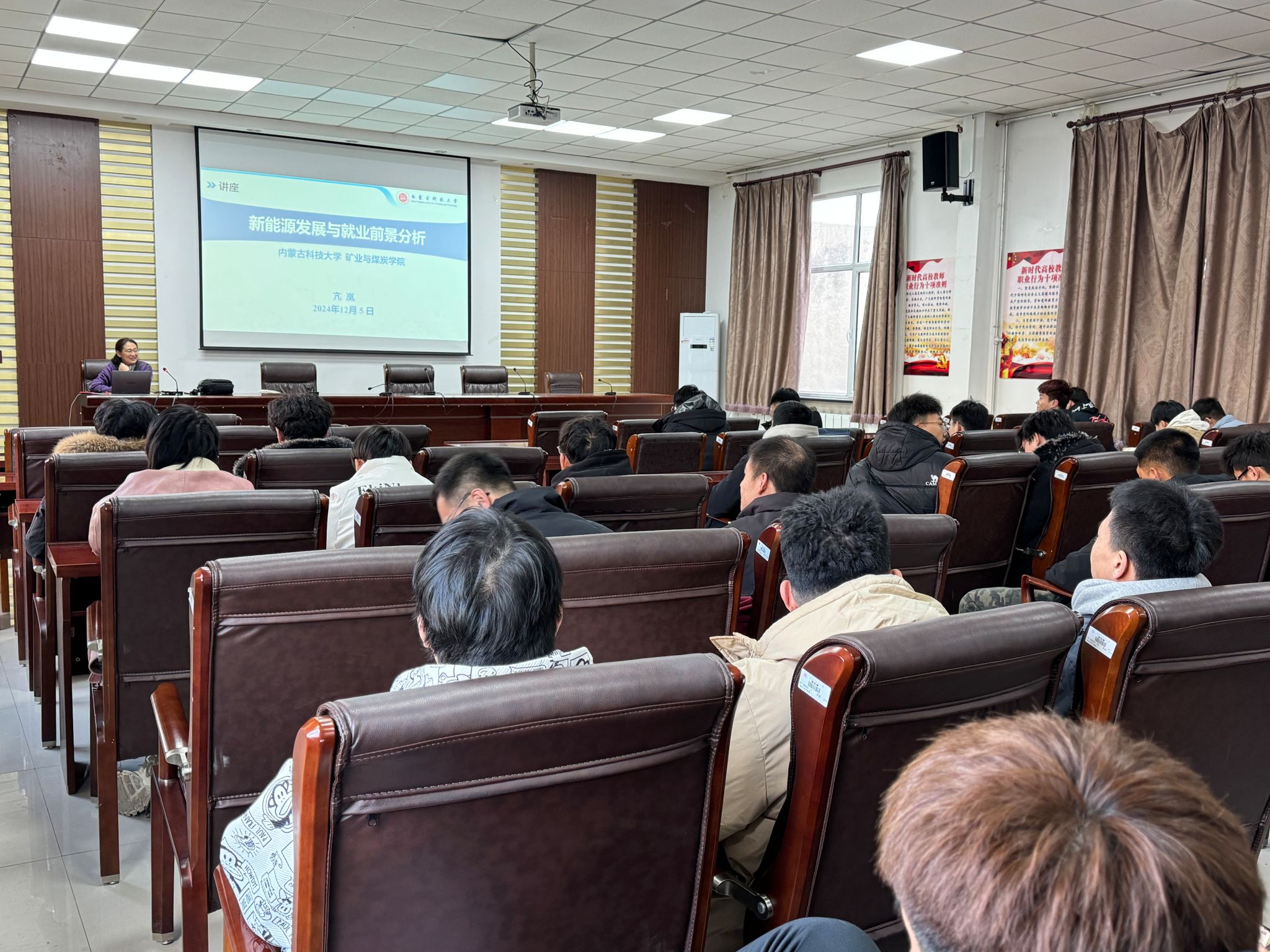 2024 年 12 月 5 日下午 16:00,乐天使在实验室训楼二楼会议室举行讲座,机电工程系教授亢岚主讲,矿山机电专业三个年级及电气自动化、机电一体化专业毕业班员工踊跃参与,主题为“新能源发展与就业前景分析”。