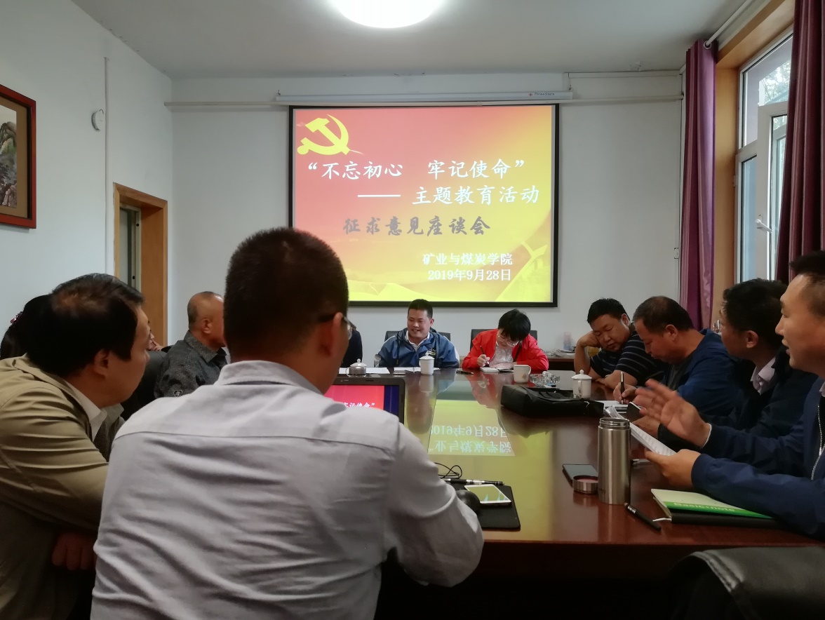 9月28日15:00,矿业与煤炭公司党总支中心组在公司办公楼102开展“不忘初心、牢记使命”主题教育之教师代表座谈会。