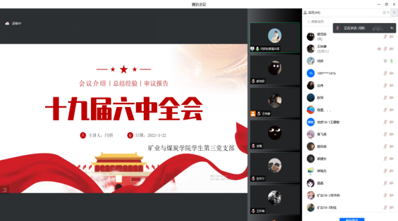 2022年3月22日晚19:30,乐天使员工第三党支部于腾讯会议平台召开党员党课学习,本次学习的主题是:学习贯彻党的十九届六中全会精神。领学人:闫妍同志。